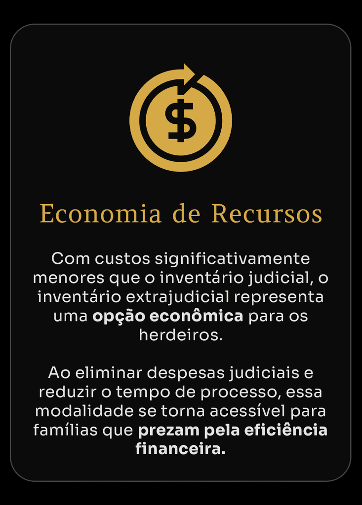 Diferente do inventário judicial, o inventário extrajudicial dispensa a tramitação no Judiciário, o que resulta em uma economia significativa de tempo e recursos. Desde que todos os herdeiros estejam de acordo com a divisão dos bens, o processo pode ser realizado em cartório, sem a necessidade de um longo e custoso processo judicial.